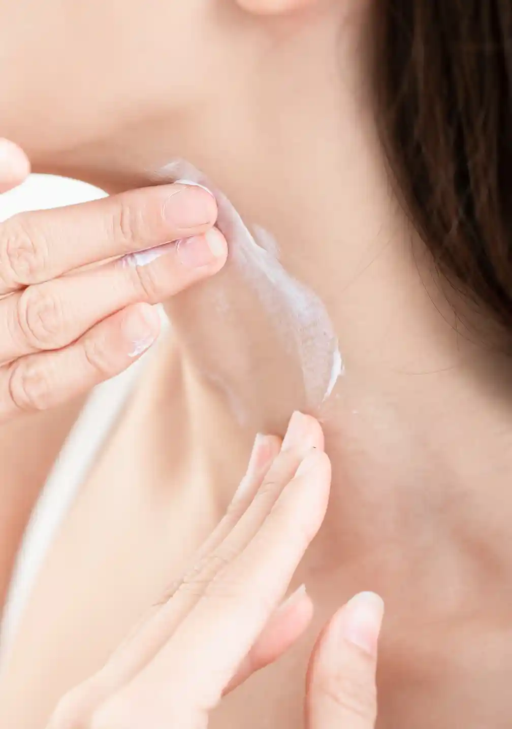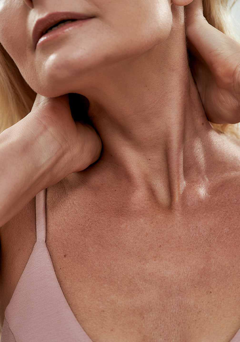 Applicare sulla pelle del collo e del décolleté e massaggiare delicatamente.